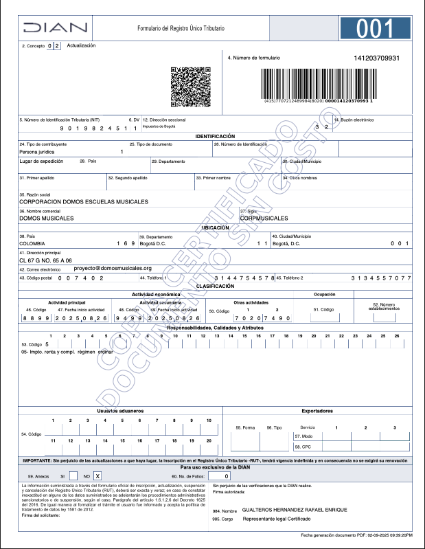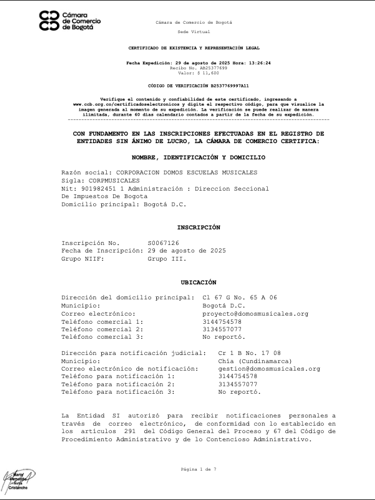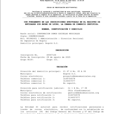 La Corporacion Domos Escuelas Musicales es una entidad sin animo de lucro (ESAL) constituida en la CCB y DIAN , con el NIT : 901982451 -1.